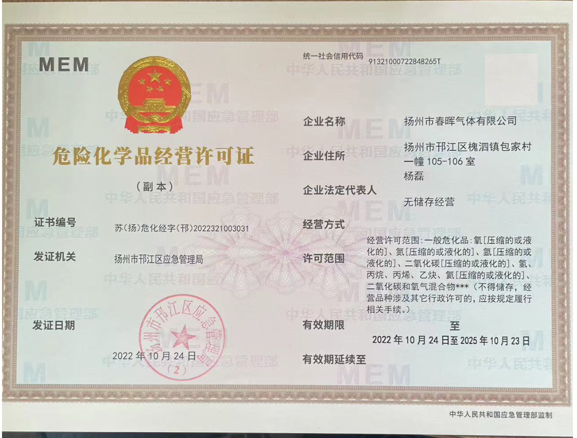 揚(yáng)州市春暉氣體有限公司于1993年揚(yáng)計(jì)經(jīng)(93)技字第042號(hào)文批準(zhǔn)生產(chǎn)工業(yè)氧氣、氮?dú)夂投趸?。企業(yè)擁有固定資產(chǎn)3000多萬(wàn)元,占地面積15000m2,建筑面積7000 m2,職工總?cè)藬?shù)68名,初級(jí)職稱(chēng)人員10名,高級(jí)職稱(chēng)人員2名,各種特種作業(yè)持證人員20名?! ∑髽I(yè)下設(shè)2個(gè)分公司及1個(gè)鋼瓶檢驗(yàn)站。即春暉氣體有限公司酒甸分公司、春暉危險(xiǎn)品運(yùn)輸有限公司、無(wú)縫氣瓶檢驗(yàn)站。主要生產(chǎn)經(jīng)營(yíng)產(chǎn)品有:液化及瓶裝氧、氮、氬、二氧化碳、乙炔、丙烷、液化天然氣、混合氣及各種高純氣體、干冰、鋼瓶...【查看更多】